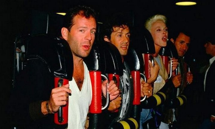 Брюс Уиллис, Сильвестр Сталлоне и Бриджитт Нильсен на американских горках, 1987 г.