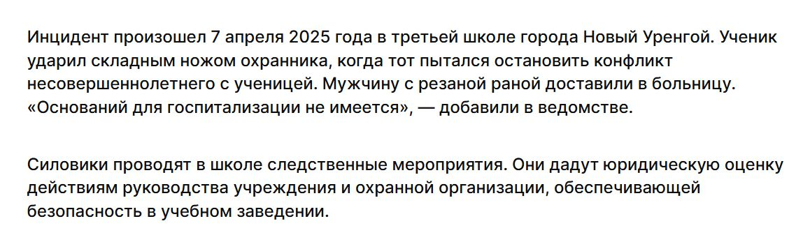 День ото дня всё больше неприятных моментов, связанных с результатами школьных реформ. Мы про это не слышим. ГД обсуждает другие дела. Проблем много. Самокаты. Курение. Бездомные животные. Но что делать с ситуацией, когда школьники бросаются друг на друга с кол...ими инструментами? Выясняют отношения друг с другом и не находя слов из-за маленького словарного запаса пускают в ход то, что есть под рукой. А ещё лучше, чтО ужЕ пронёс собой в школу недо-ученик и недо-подросток и недо-человек. Потому как нормального человека из него уже сделали. Предпоследний раз это была школьница на снегу в Подмосковье, а недавно школьник в Новом Уренгое. Думаю, подробности вы читали в прессе. Это уже стало до ужаса часто происходить. Вот информация из СМИ- Дзен такие детали и подробности не любит. Да какая разница, кто и что любит. Смысл в том, что сделали из школ. То, что там давно учителям некогда разговаривать с детьми и знать, что происходит в душе ребёнка, уже не новость. То, что многие семьи у