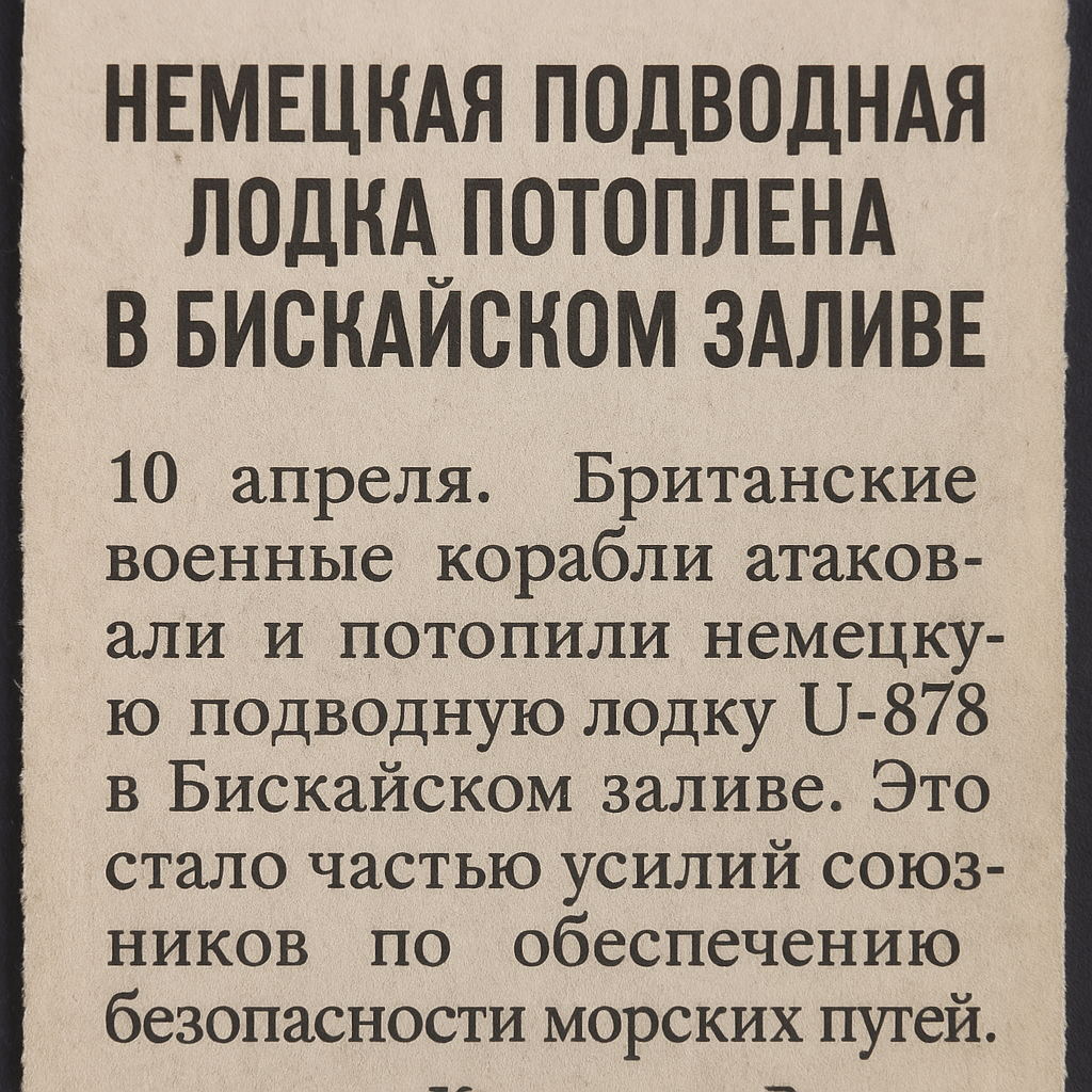Морская сводка нашего корреспондента с атлантического побережья. Сегодня, 10 апреля 1945 года британские военно-морские силы нанесли очередной удар по флоту нацистской Германии. В Бискайском заливе, вблизи западного побережья Франции, глубинными бомбами была уничтожена немецкая подводная лодка U-878. По имеющимся данным, лодка была обнаружена в ходе патрулирования союзных сил и не успела скрыться на глубине. Экипаж корветов немедленно открыл атаку, и после серии точных сбросов глубинных зарядов субмарина получила критические повреждения и затонула. U-878 относилась к типу IXC/40 — это крупные океанские подлодки, предназначенные для дальнего плавания и атак на союзные конвои. С момента своего ввода в строй лодка успела выйти в один боевой поход, но не зарегистрировала ни одной потопленной цели. Сегодня её путь окончен. Этот успех стал очередным шагом в обеспечении безопасности Атлантических морских маршрутов. По словам британского командования, охота на «волчьи стаи» немецких подлодок п