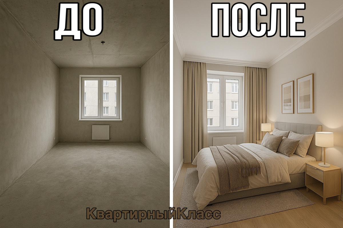 ⚒️Ремонт квартир до и после: от черновой отделки до уюта за 21 день 📌На фото — типичная картина новостройки: бетонные стены, голый пол и отсутствие уюта. Стандартная "коробка", в которой сложно представить будущий комфорт. Но посмотрите, как легко всё меняется! ✅Компания "КвартирныйКласс" всего за 21 день полностью преобразила пространство, превратив пустую комнату в современную и уютную спальню. Элегантные оттенки, качественные материалы, стильная мебель — теперь здесь хочется жить! Что мы сделали: Профессиональный ремонт квартиры под ключ; Выравнивание стен и потолков; Черновая и чистовая отделка квартир; Разводка электрики и монтаж освещения; Укладка напольных покрытий; Полное оформление интерьера. Работаем строго в сроки — без задержек и переносов. Уже через 21 день вы получаете готовую квартиру, в которую можно сразу заехать. ❓Почему выбирают КвартирныйКласс? ✅6 лет на рынке — более 500 успешно выполненных объектов; ✅Профессиональный ремонт новостроек и вторичного жилья; ✅Компле