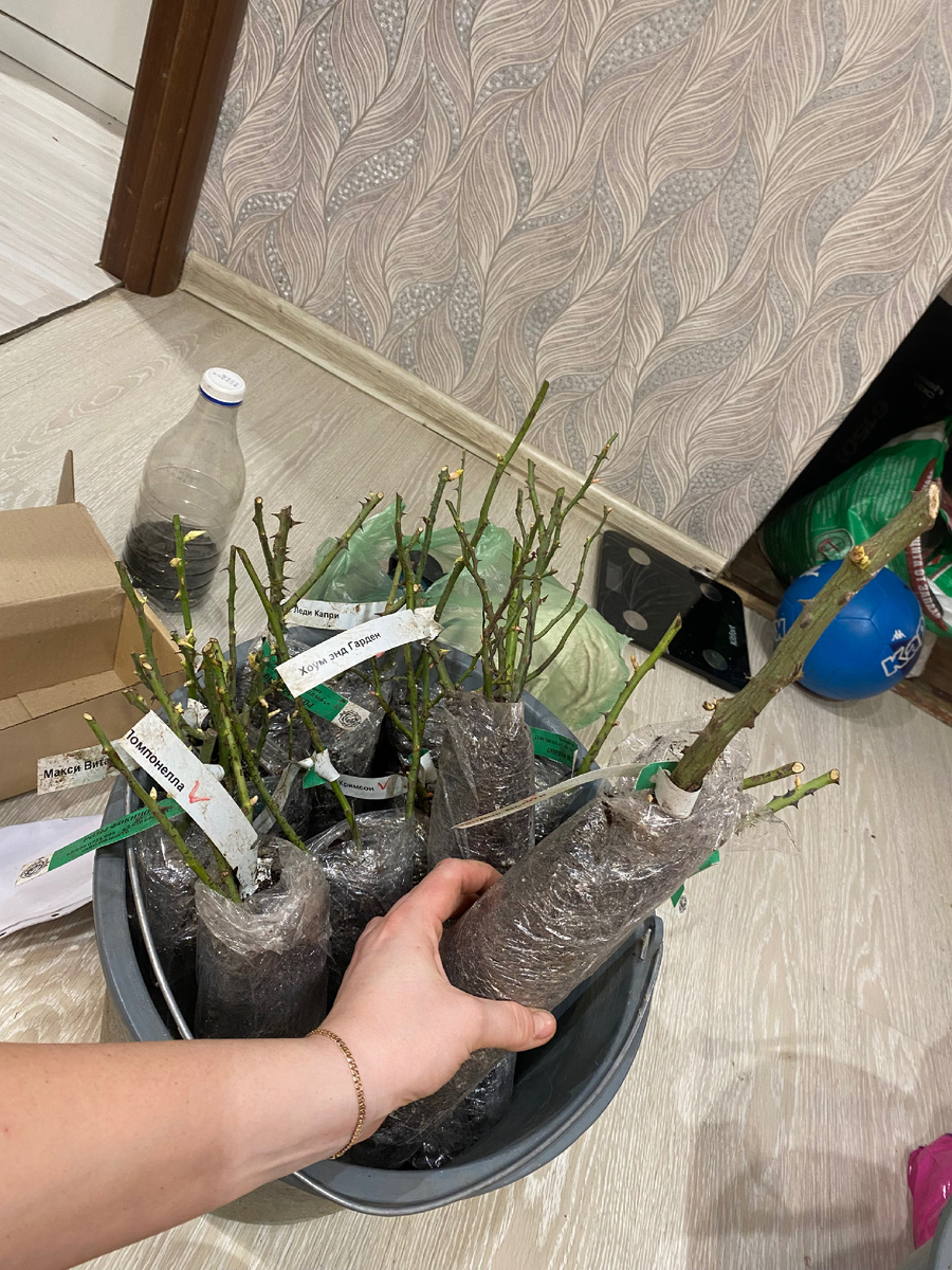Всем добрый день! Как и обещала,продолжаю писать про питомники роз и свои посылки на нынешний год . Зимой 2025 я заказала розочки в 6 известных питомниках ,двое из которых я уже опробовала в прошлом году . Итак ! 15 штук от Фокино (4 розы в полную стоимость и 11 штук уценки .Уценка была по 250 р .На самом деле очень ею довольна .В прошлый год у Фокинцев взяла только одну уценочку . Вообще саженцы от Фокино были первыми из питомников ,что ко мне приехали .Я с ними даже успела поконфликтничать .И брать у них больше розы не хотела ,пока мой скромный заказ из трех розюшек не зацвел .Сказать что я испытала восторг -это ничего не сказать! Розы у них цвели как сумасшедшие! Я взяла в этом году гораздо больше . Начнем! Приехало все в большой коробке из под бананов)) Саженцы хорошо были упакованы в этот раз .Земли просыпалось немного . Каждой розочке я сделала надрез внизу тубуса и поставила в заранее подготовленные 20 л ведра . Не понимаю в чем отличия уценки от полного размера ,потому что они
