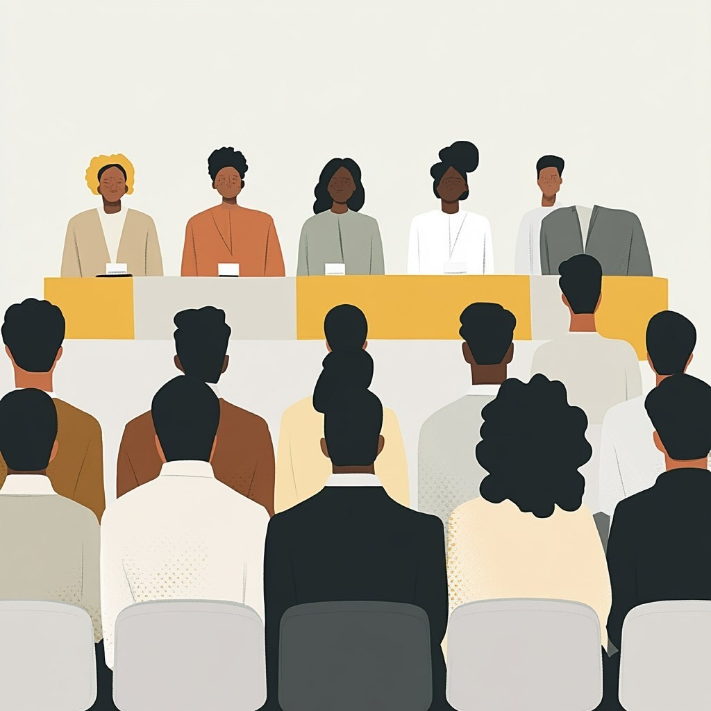 Создано на основе запроса: illustrate a nice icône representing an symbolizing a conference with experts. The audience and the 5 experts are mixed-race and black people, by a graphic designer, drawing, symbol,abstract, minimalis --- Автоперевод: Иллюстрируйте хорошую Icône, представляющая символизирующую конференцию с экспертами. Как тебе картинка? 🤔 https://dzen.ru/id/65c0c65c86e4f837c27b24d7 #ИИ #AI #нейросеть #midjourney #art