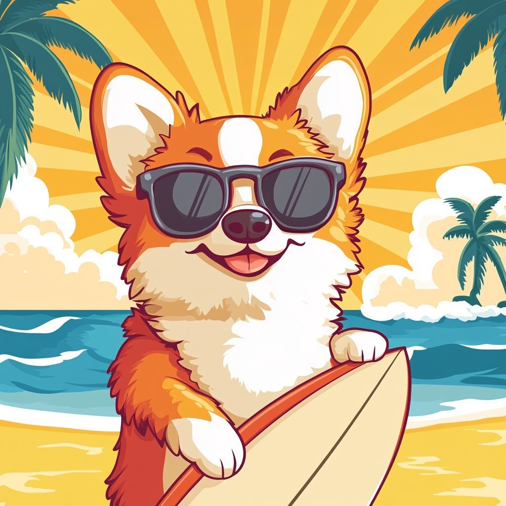 Создано на основе запроса: Cute cartoon vector-style drawing of an orange and white Pomenarian dog wearing sunglasses, holding a surfboard on the beach with palm trees, ocean waves, and sun rays in the background, against a blue sky with white clouds, in a yellow color palette, with a simple flat design, 2D illustration, bold lines, vibrant colors, and low detail.