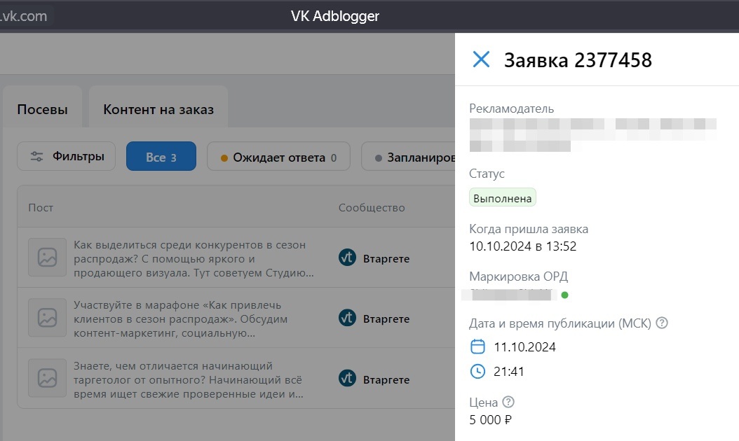 VK Adblogger работает: 3 размещения по 5к за месяц
