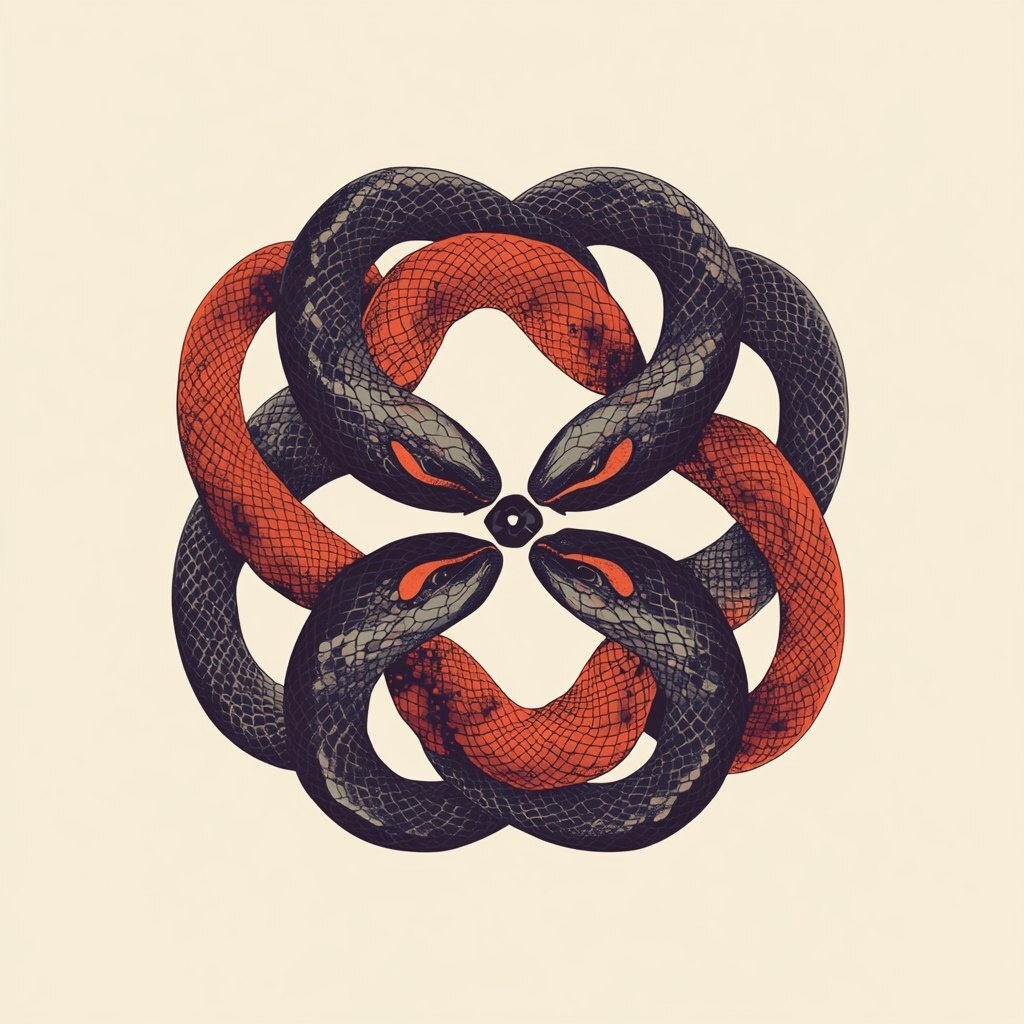 Создано на основе запроса: A logo featuring four snakes coiling around each other in an intricate pattern, their bodies forming the shape of
