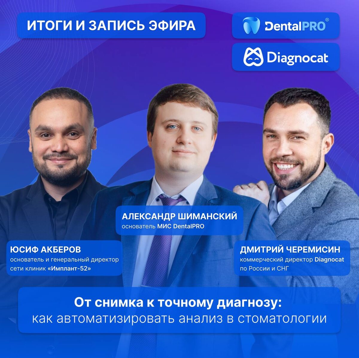 Совместный эфир Diagnocat и МИС DentalPRO завершен. Настало время поделиться записью💘 В прямом эфире эксперты рассказали: 🔵 О пользе ИИ в стоматологии 🔵 О росте доверия пациентов 🔵 Об уменьшении юридических рисков 🔵 О том, как повысить эффективность клиники 🔵 О взаимодействии DentalPRO и Diagnocat Спикеры: 🦷 Александр Шиманский — основатель МИС DentalPRO ⭐ Дмитрий Черемисин — коммерческий директор Diagnocat по России и СНГ ⭐ Юсиф Акберов — основатель и генеральный директор сети клиник «Имплант 52» Запись вебинара опубликована на ведущих российских площадках: 😄 ВКонтакте 🥰 Rutube Подписывайтесь на наш Telegram-канал, чтобы не пропустить следующие эфиры! Дальше все будет еще интереснее. #Вебинары