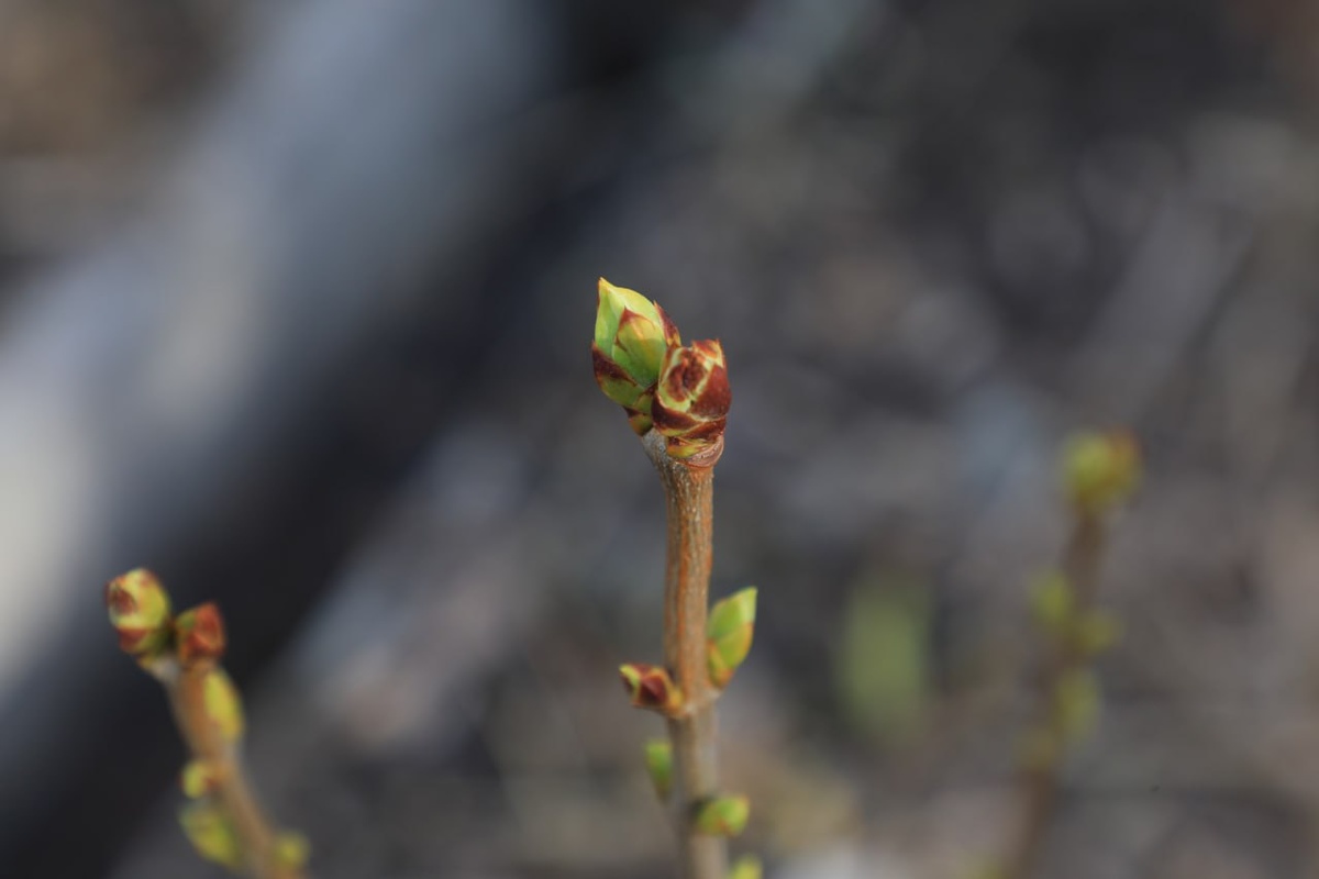Почки раскрываются, шоколадные, с зелёными хвостиками, и на каждом зелёном клювике висит большая прозрачная капля.