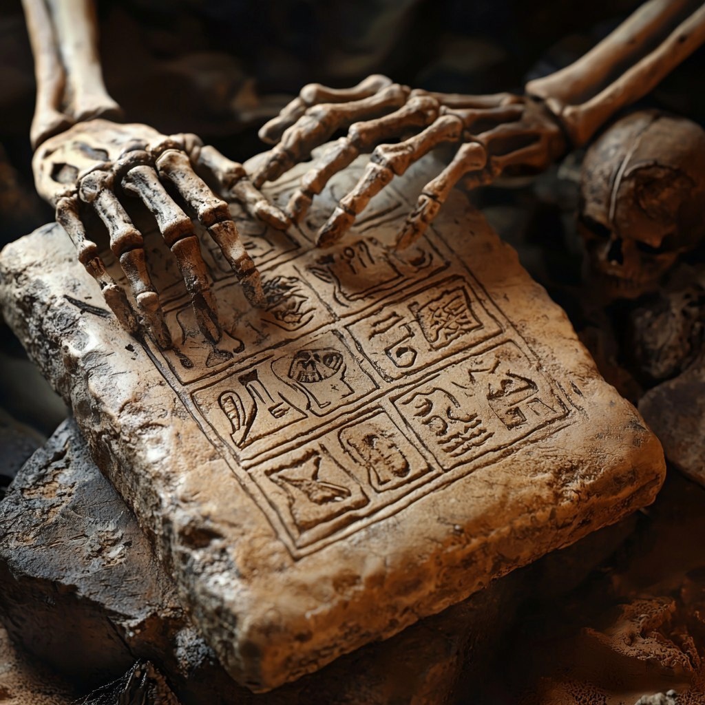 Создано на основе запроса: reading stone tablet with cute skeletal hands, ancient symbols instructions