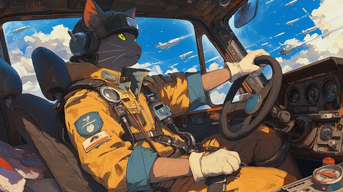 Создано на основе запроса: a kitty as a taxi cable driver, latent spaceships taxidriver, cartoon, moebius style