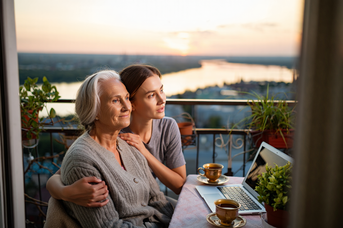 Прошел год. Анна Петровна сидит на балконе и смотрит на Волгу. Рядом Марина с ноутбуком – работает из дома.