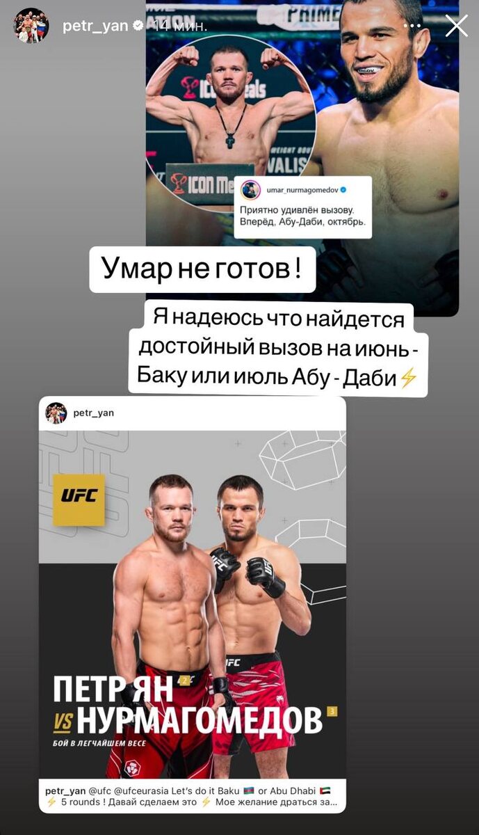 ❌ «Умар не готов» Пётр Ян опубликовал новый пост, в котором выразил надежду, что он сможет выступить против достойного оппонента уже в июне этого года. В то же время в команде Умара Нурмагомедова объяснили, почему, несмотря на согласие бойца разделить с Яном октагон, сделать это не получится именно летом. «Такой бой может пройти в Абу-Даби в октябре. Умар до сих пор залечивает свою травму, пока мы особенно не видим горизонт возвращения. Изначально мы планировали, что он вернётся к концу лета, но немного больше времени занимает процесс его восстановления. Мы будем отталкиваться от его восстановления», — сказал ТАСС менеджер Нурмагомедова Ризван Магомедов. @russian_rt_sport