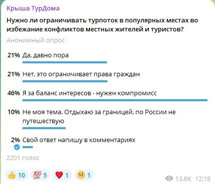 Судя по итогам нашего опроса, сторонников ограничения турпотока в популярных туристических местах оказалось столько же, сколько и