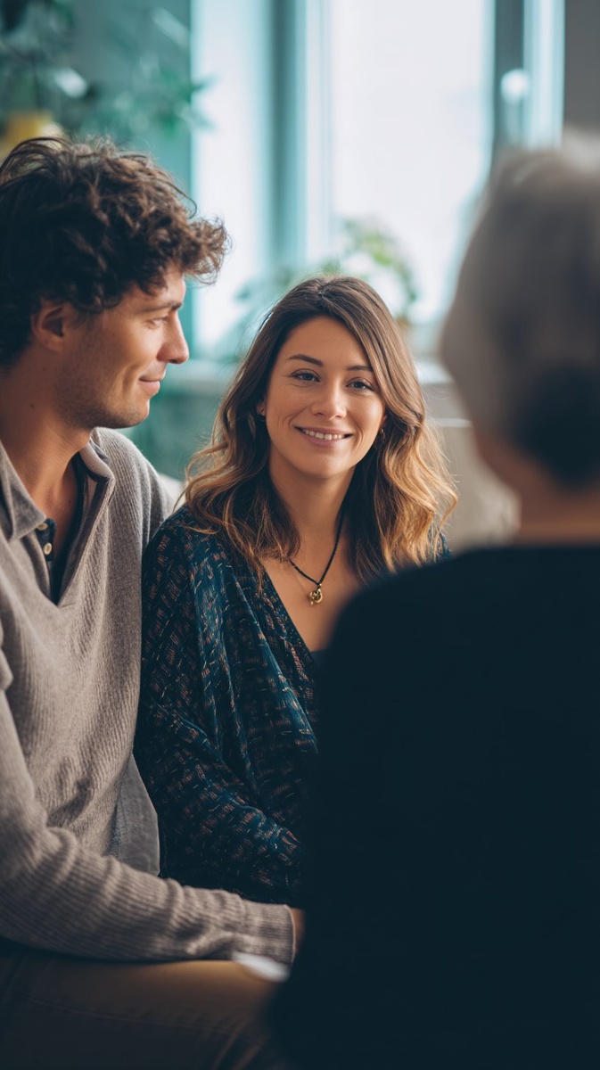 Создано на основе запроса: Photorealistic image of a caring counselor speaking gently with a couple in a warm supportive environment, pregnancy and infant loss support, soft natural daylight through windows, shallow depth of field, all subjects in focus, charity theme, approachable warm expressions, simple composition, no foreground objects blocking view, cinematic color grading, high resolution