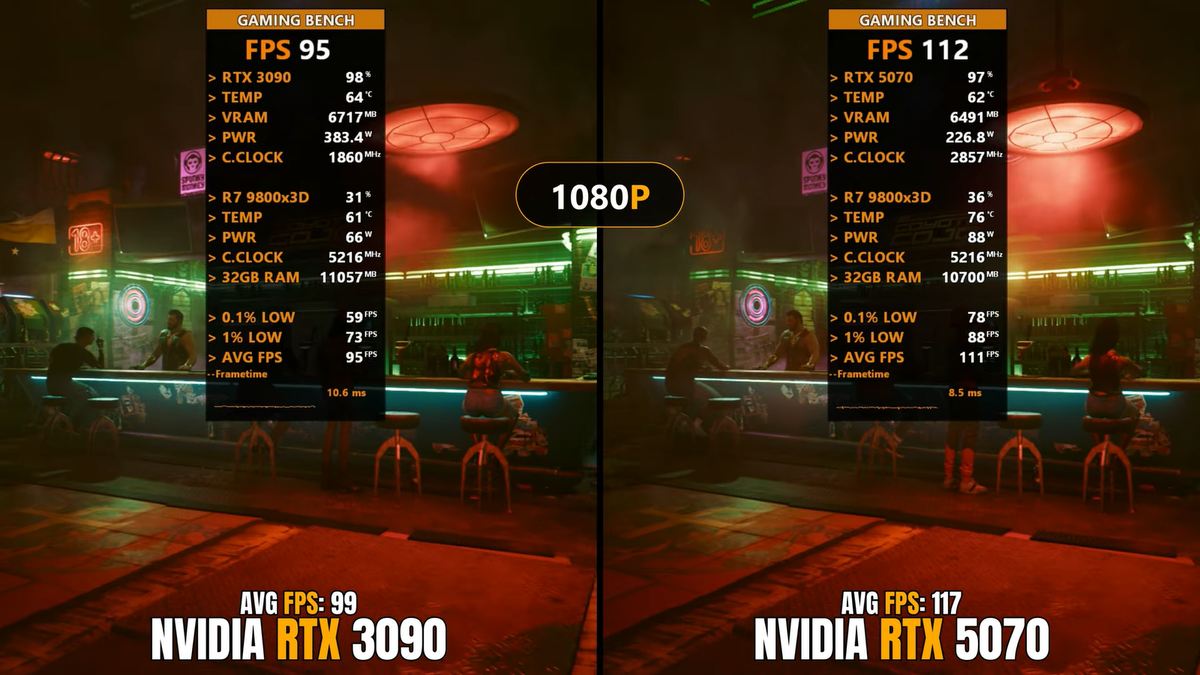 На YouTube-канале GAMING BENCH — RGB проверили в 1080р, 1440р и 4К видеокарты RTX 5070 и RTX 3090. Cyberpunk 2077 запускалась с графикой Custom. В 1080р удалось в этой игре получить 99 к/с (RTX 3090) и 117 к/с (RTX 5070), в 1440р — 62 и 75 к/с соответственно, в 4К — 29 и 32 к/с соответственно. Assasson Creed Mirage тестировалась тоже с пресетом Custom. В разрешении Full HD средний FPS в этой игре составил 129 к/с (3090) и 156 к/с (5070), в 2К — 110 и 134 к/с соответственно, в 4К — 73 и 83 к/с соответственно. В игре Ghost Of Tsushima на настройках графики Very High в 1080р средняя производительность находилась на уровне 96 к/с (3090) и 124 к/с (5070), в 1440р — 76 и 92 к/с соответственно, в 4К — 72 и 50 к/с соответственно. Alan Wake 2 шла с графикой Medium. Средняя производительность в этом проекте составляла в 1080р — 81 (3090) и 84 к/с (5070) соответственно, в 1440р — 62 и 60 к/с соответственно, в 4К — 36 и 33 к/с соответственно. Hellblade 2 запускалась с пресетом High. Средний FPS в