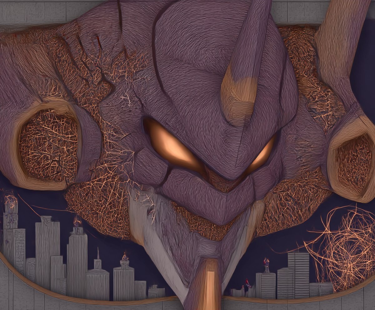 Создано на основе запроса: EVA Berserk Mode Activation: Unit-01 breaking free from its restraints, eyes glowing with primal rage as its armour plates crack to reveal pulsing organic tissue beneath. The surrounding cityscape is illuminated by its ethereal energy signature as NERV spaceships personnel frantically attempt to regain control from their command centre
