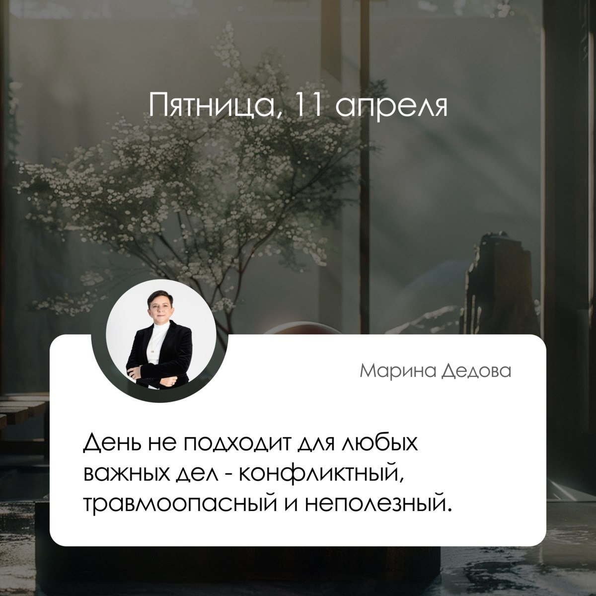 ✅ Прогноз на 11 апреля, пятница Ра.рушение День не подходит для любых важных дел - конфликтный, травмоопасный и неполезный день. Постарайтесь провести его спокойно, не ссорьтесь с близкими, особенно с противоположным полом, не предъявляйте претензии, не торопитесь. Не начинайте ремонт, не переезжайте в новый дом, не начинайте важные проекты, повышенная внимательность на дорогах, при занятиях спортом. Более внимательными и осторожными стоит быть рожденным в год Дракона и Собаки. Лучшие часы: Бык (01-03), Лошадь (11-13), Коза (13-15) Худшие часы: Крыса (00-01), Дракон (07-09), Собака (19-21) Пустые часы: Тигр (03-05), Кролик (05-07) *Прогноз дня указывает общие тенденции. Для важных событий даты лучше выбирать индивидуально. Лучшие часы – хорошее время для многих дел. Худшие часы – не подходят для большинства начинаний. Пустые часы – достаточно бесполезное время для важных дел.
