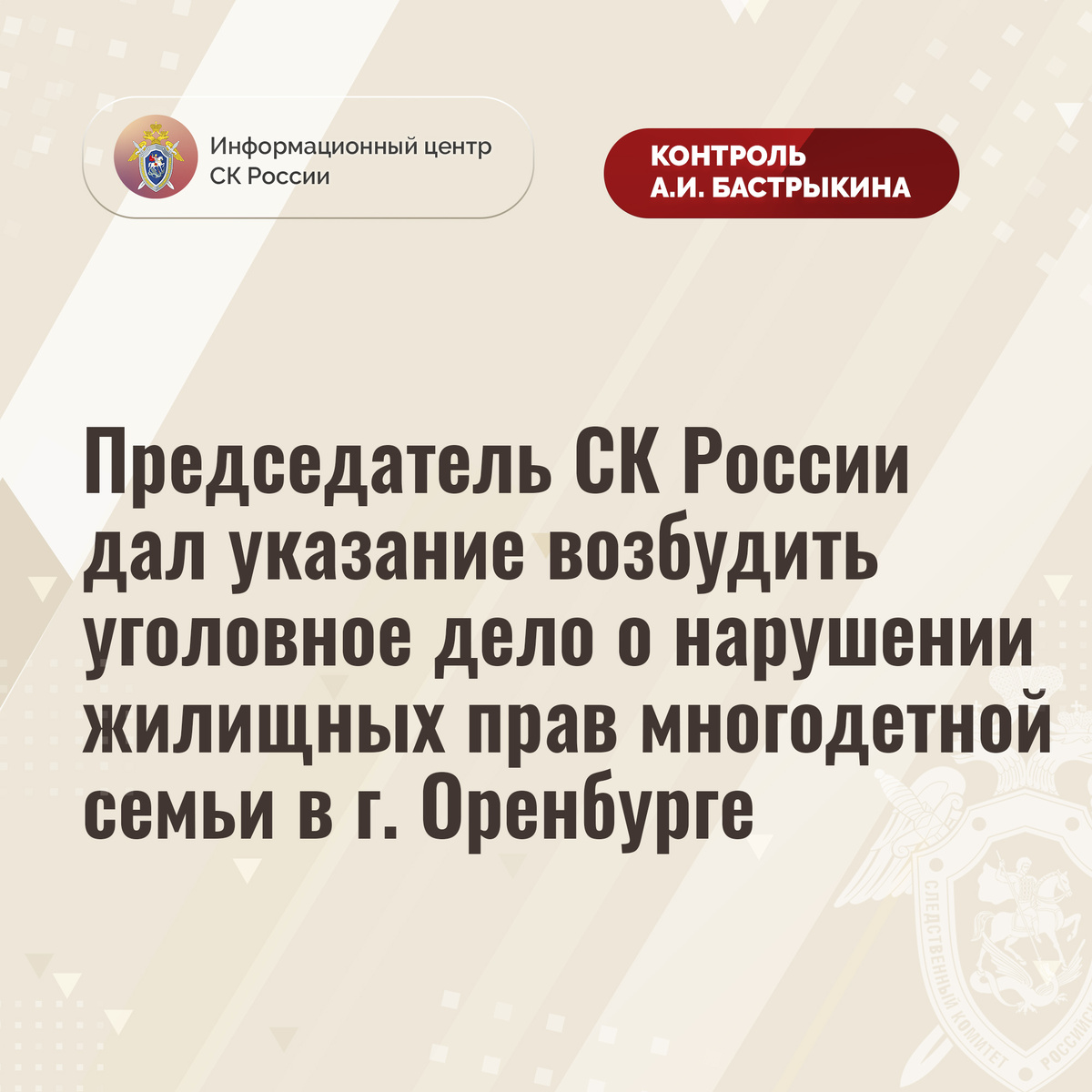 Председатель СК России дал указание возбудить уголовное дело о нарушении жилищных прав многодетной семьи в г. Оренбурге В комментариях в аккаунте приемной Председателя СК России А.И. Бастрыкина «ВКонтакте» обратилась многодетная мать из города Оренбурга по вопросу несогласия с результатами установления обстоятельств длительного необеспечения ее семьи, в том числе ребенка-инвалида, положенным по закону жилым помещением. С февраля 2022 года женщина состоит в специализированной очереди, при этом в июне прошлого года суд обязал администрацию предоставить заявительнице жилплощадь по договору социального найма во внеочередном порядке. До настоящего времени решение не исполнено, права семьи не реализованы, и женщина вынуждена арендовать квартиру за свой счет. Ранее А.И. Бастрыкин поручал представить доклад по указанной ситуации. В СУ СК России по Оренбургской области по данному факту проводилась процессуальная проверка. Председатель Следственного комитета Российской Федерации Александр Иванов