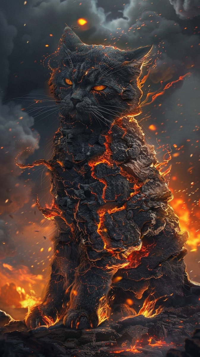 Создано на основе запроса: a bipedal cat with rough, cracked volcanic stone-like fur, glowing lava patterns across his body. His face is partially covered by a burning molten mask, one eye blazing with rage. He stands in the center of a smoldering battlefield, with erupting earth and flames around him. Ashes fall from the sky, smoke and molten rocks fill the cursed domain. Epic and apocalyptic mood. --- Автоперевод: Двухвостчик с грубым, потрескавшимся вулканическим каменным мехом, светящимися лавовыми узорами на теле. Как тебе изображение? 🤔 https://dzen.ru/id/65c0c65c86e4f837c27b24d7 #ИИ #AI #нейросеть #midjourney #art