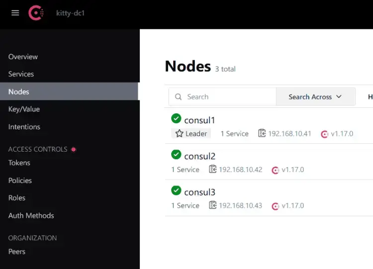 Вы увидите доступные серверы в кластере. Для получения детальной информации о каждом сервере перейдите в меню Nodes, а для просмотра списка ключей-значений — в меню Key/Value.