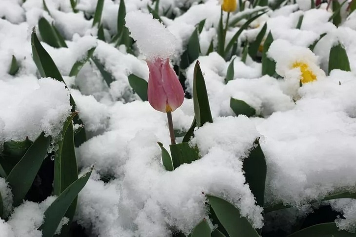 В Саратовской области после температуры воздуха +22 градуса выпал снег. Как сообщает ИА «СарИнформ», под снежным покровом оказались и цветущие деревья, и клумбы. Издание уточняет, что снег выпал в ночь на 10 апреля в Александрово-Гайском районе Саратовской области. В связи с этим местные власти призвали жителей быть осторожнее на дорогах из-за осложнения метеоусловий. Глава района, в свою очередь, опубликовал фотографии, на которых снегом завалило цветущие тюльпаны. – Мороз в три градуса, а вишня вся в цвету. Не могу одобрить нашего климата, – процитировал «Вишневый сад» Чехова Сергей Зюзин. Напомним, что в Волгоградской области кратковременный снегопад случился 8 апреля в Урюпинском районе. Здесь, правда, свойственные зиме, а не апрелю осадки напомнили о себе стремительно и за считанные минуты растаяли. Фото: глава Александрово-Гайского района Саратовской области Сергей Зюзин
