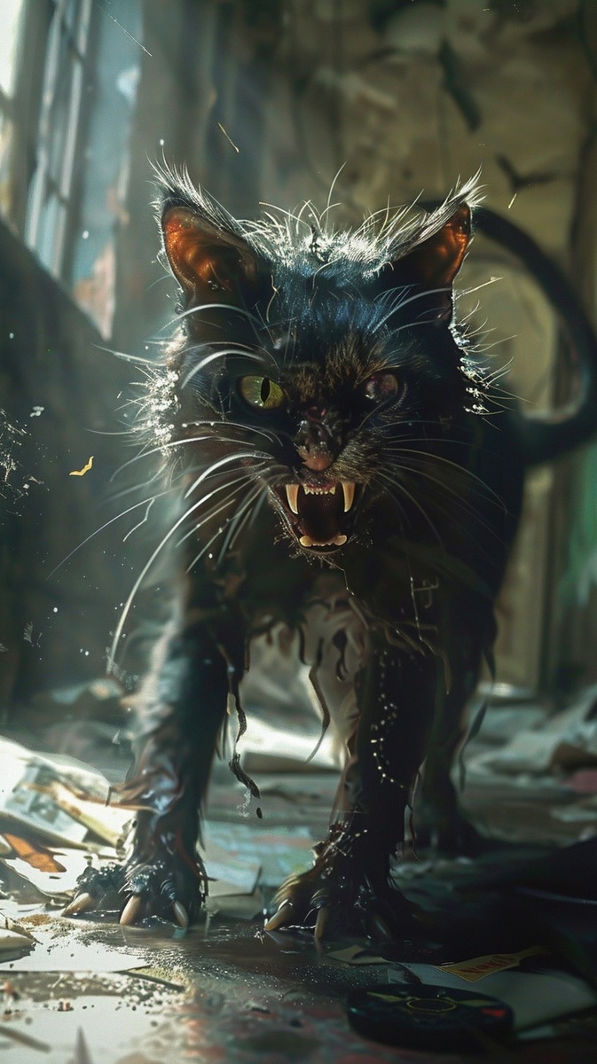 Создано на основе запроса: a terrifying photorealistic bipedal cat mutated by cursed energy, fur falling off in patches, long sharp claws and a deformed face with multiple glowing eyes. Its mouth opens too wide, filled with black mist and twisted fangs. It crouches in an abandoned apartment complex dripping with cursed aura, talismans fluttering in the wind. Shadows move unnaturally around it. Haunting, grotesque, and otherworldly. --- Автоперевод: Ужасный фотореалистический кот, мутировал проклятую энергию, мех, падающий в пятнах, длинные острые когти и деформированное лицо с множественными светящимися глазами. Как тебе такая иллюстрация? 🤔 https://dzen.ru/id/65c0c65c86e4f837c27b24d7 #ИИ #AI #нейросеть #midjourney #art