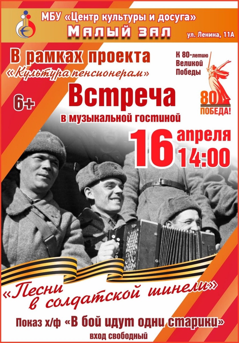 📌 16 апреля ✅ 14:00 🏛 Малый зал Центра культуры и досуга Встреча в музыкальной гостиной "Песни в солдатской шинели" ✅ В рамках городского проекта "Культура - пенсионерам" состоится концерт, посвященный 80-летию Победы в Великой Отечественной войне и показ художественного фильма "В бой идут одни старики". 🎶 Для зрителей выступят: - клуб любителей музыки "Автор" - солистки ансамбля народной песни "Рощица" 6+ ВХОД СВОБОДНЫЙ!