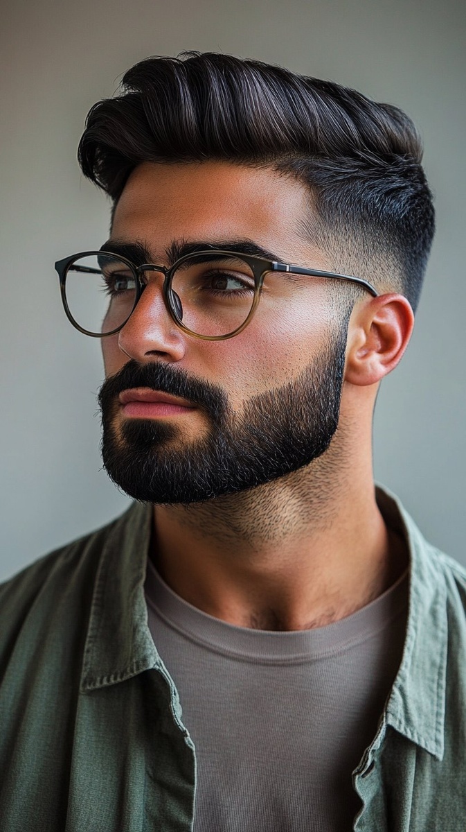 Создано на основе запроса: professional photo of a slightly tanned professional wearing smart clothing, short black shaped beard, skin fade haircut, wearing rayban glasses