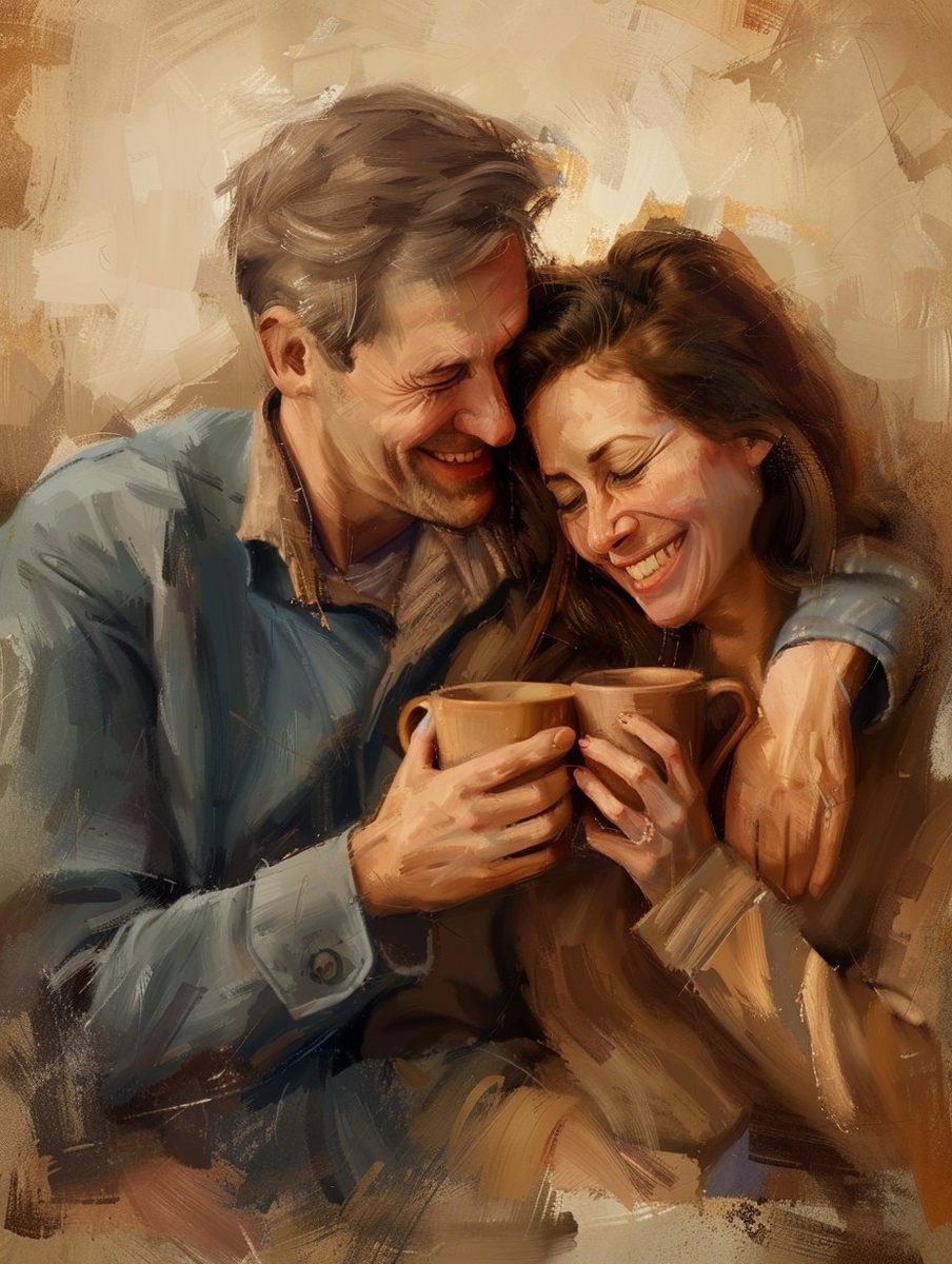 Создано на основе запроса: mantic illustration of a white couple (male and female) in their 40s cuddling playfully, casual clothing, chill