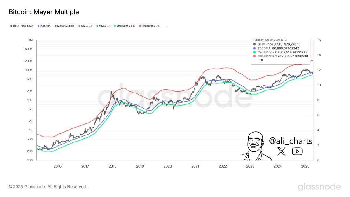 Если судить по индикатору Mayer Multiple, то BTC имеет сильную поддержку на уровне $69,5k. Прорыв выше $86,9k может дать почву для роста до вершины рынка (пик цикла) – $208 550.