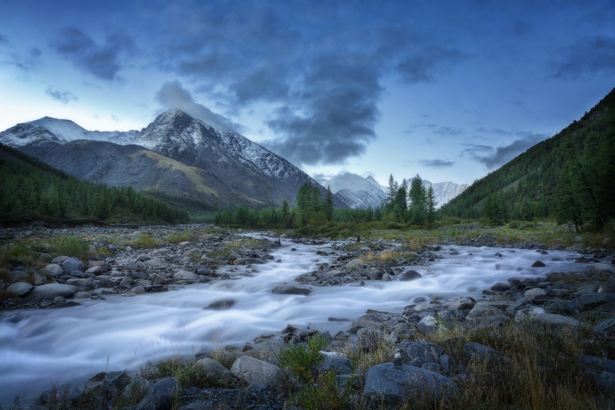 Стремительные воды Аккема в утреннем свете. Алтай.