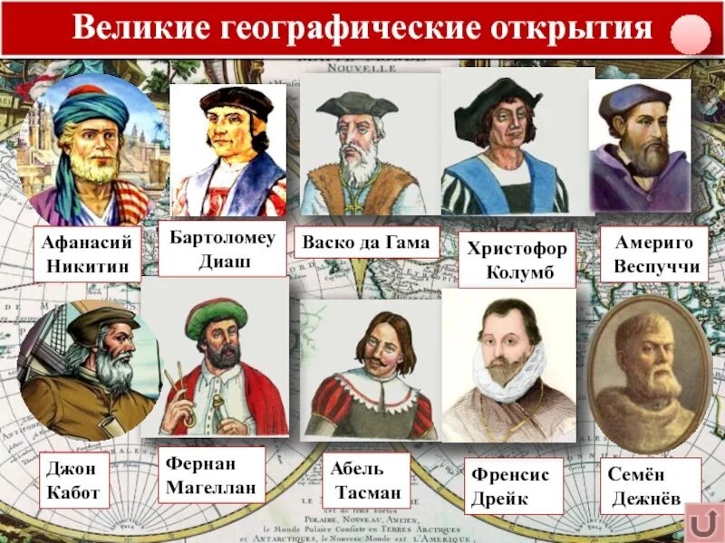 1.Христофор Колумб (1492): Итальянский мореплаватель, который под флагом Испании открыл Америку в 1492 году, совершив четыре экспедиции к новым землям. 2.Васко да Гама (1498): Португальский исследователь, который первым достиг Индии морским путем, обогнув Африку. 3.Фернан Магеллан (1519-1522): Португальский мореплаватель, который возглавил первую экспедицию вокруг света. Хотя он сам не завершил путешествие (погиб на Филиппинах), его команда доказала, что Земля круглая. 4.Америго Веспуччи: Итальянский исследователь, который первым осознал, что открытые Колумбом земли являются новым континентом (Америка названа в его честь). 5.Джон Кабот (1497): Итальянский исследователь, который под английским флагом открыл часть североамериканского побережья.