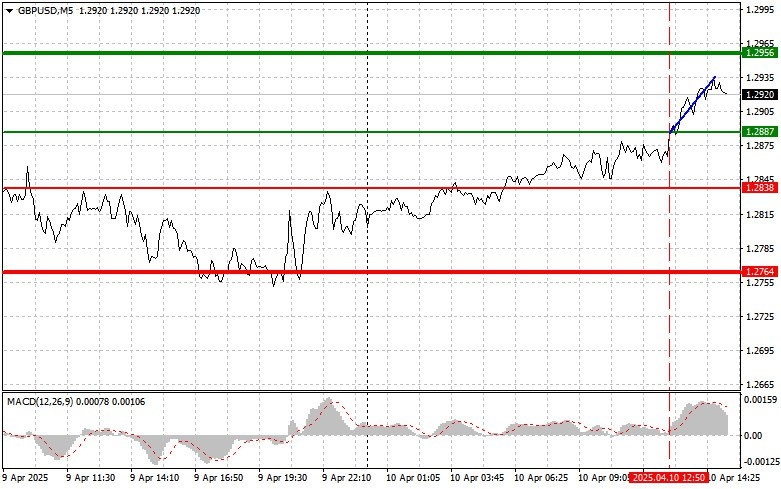 Тест цены 1.2887 пришелся на момент, когда MACD только начинал движение вверх от нулевой отметки, что стало подтверждением правильной точки входа на покупку фунта. В результате фунт вырос на 40 пунктов.