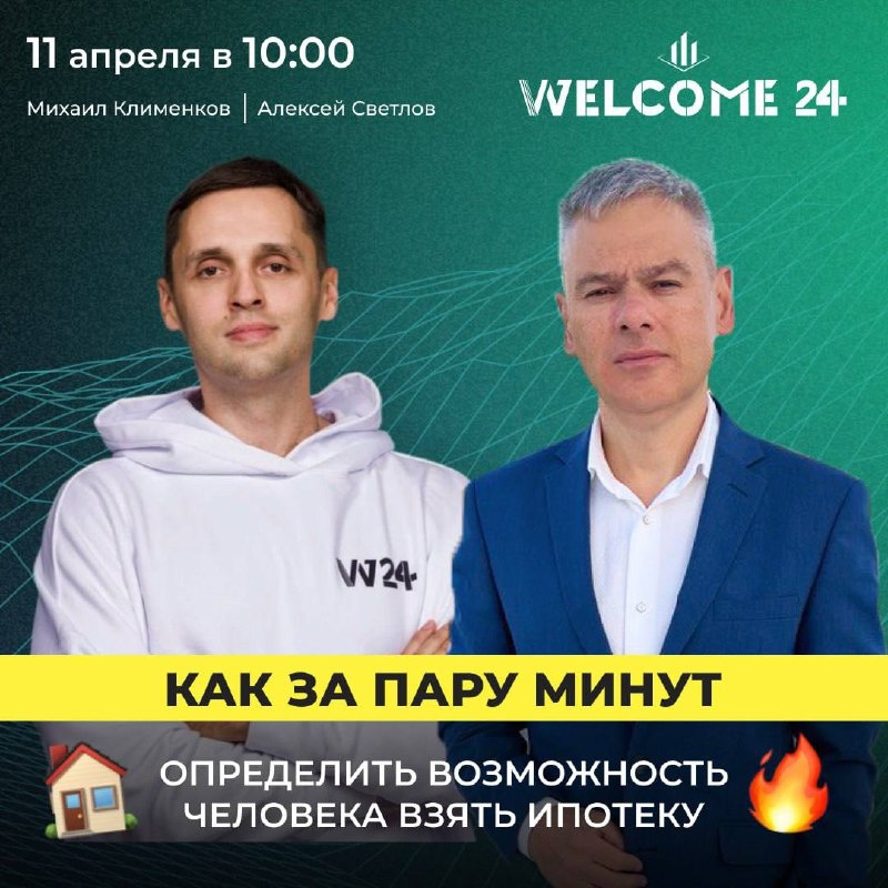 Уже завтра спасём вас от пустых показов и бессмысленных катаний по городу 🔥 В эту пятницу в 10:00 по мск разберем главный вопрос риелторов: Как за 2 минуты понять — дадут клиенту ипотеку или нет? Что будет на вебинаре: — Простая схема проверки покупателя — Ошибки, из-за которых риелторы теряют время — Инструменты, которые реально работают без помощи брокеров на показах Спикеры: — Михаил Клименков, гендиректор WELCOME 24 — Алексей Светлов, ипотечный брокер-практик После эфира вы будете точно знать: → Кто ваш реальный покупатель → А кто просто мечтатель без одобренной ипотеки ✅Вебинар пройдёт в нашем телеграм-канале Будет полезно, практично и без воды, поставьте себе напоминание в календаре 😎