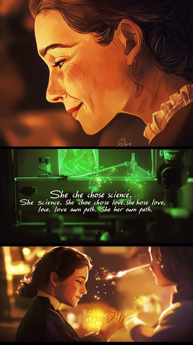 Создано на основе запроса: Anime-style vertical illustration telling an emotional life story in three parts: At the top, a close-up portrait of Marie Curie’s thoughtful face, softly lit, gazing slightly downward. In the middle section, a warmly lit laboratory where she is seen conducting an experiment with glowing substances, focused and serene. At the bottom, a nostalgic black-and-white photo-style frame of Curie smiling gently with her daughter, holding hands. At the very bottom, cinematic text reads: "She chose science. She chose love. She chose her own path." Emotional atmosphere, warm tones, soft lighting, elegant and respectful tone, vertical visual storytelling for YouTube Shorts --- Автоперевод: Вертикальная иллюстрация в аниме, рассказывающая историю эмоциональной жизни в трех частях: на вершине-портрет вдумчивого лица Мари Кюри, мягко освещенное, слегка смотрящее вниз. Интересно выглядит? 🤔 https://dzen.ru/id/65c0c65c86e4f837c27b24d7 #ИИ #AI #нейросеть #midjourney #art