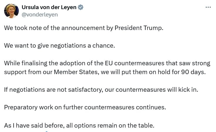 Yevroittifoq AQSHga qarshi boj tariflarini 90 kunga kechiktirdi. Bu Oq uyning xuddi shunday qaroridan so‘ng yuz bermoqda Yevropa Komissiyasi prezidentining ma'lum qilishicha, 15-aprel kuni kuchga kirishi kerak bo‘lgan boj tariflari vaqtincha to‘xtatildi. Bu muzokaralarga imkon berish uchun qilinmoqda. "Agar muzokaralar natijasiz yakunlansa, bizning javob choralarimiz kuchga kiradi", — dedi Ursula fon der Lyayen. @daryolive