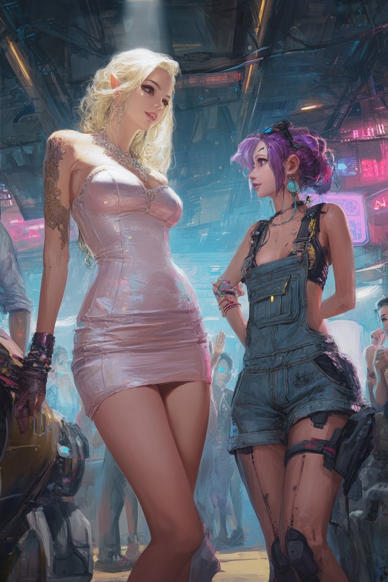 Создано на основе запроса: a full body shot of two female cyberpunk characters partying, one is a beautiful, elegant female elf with a tight futuristic dress and long blonde hair, the second is a cute female human cyberpunk mechanic with scruffy purple hair and a tank top and overalls. In the background is a cyberpunk bar. Night. Dynamic lighting. detailed digital painting --- Автоперевод: Полное тело, выстрел из двух женских персонажей киберпанка, которые играют в вечеринке, один - красивый, элегантный женский эльф с плотным футуристическим платьем и длинными светлыми волосами, вторая - милая женщина -киберпанк с человеческим киберпанк с грязными фиолетовыми волосами, майкой и комбинезонами. Круто получилось? 🤔 https://dzen.ru/id/65c0c65c86e4f837c27b24d7 #ИИ #AI #нейросеть #midjourney #art