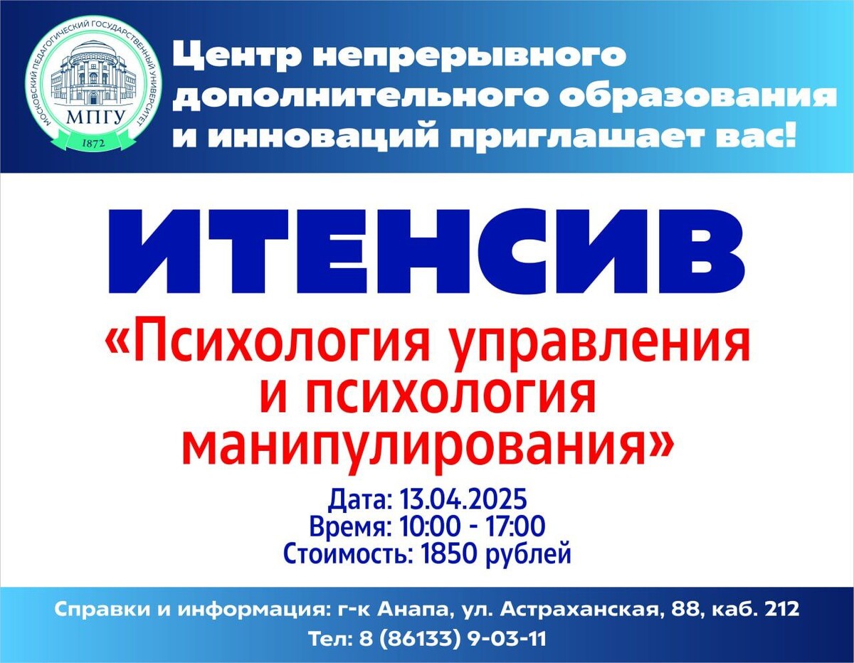 Анапский филиал МПГУ приглашает на практический интенсив "ПСИХОЛОГИЯ УПРАВЛЕНИЯ И ПСИХОЛОГИЯ МАНИПУЛИРОВАНИЯ"👍 👩🏫Спикером выступит Елена Черкасова, кандидат психологических наук, доцент кафедры криминалистики, полковник юстиции, член Российской психотерапевтической ассоциации, автор курсов по психотерапии и гипнозу. 📘Слушатели получают свидетельство о прохождении практического интенсива. 📆Дата: 13 апреля. 📌Стоимость: 1 850 руб. Запись осуществляется путем вступления в информационную группу по ссылке https://chat.whatsapp.com/BcRcJ6tu6MB6zGpngttA1z 📍Справки и дополнительная информация по адресу: Анапа, ул. Астраханская, 88, кабинет 212 или по телефону: 8-86133-9-03-11. 😀До встречи!🔥🔥🔥 #АнапаСегодня #НовостиАнапыСегодня #НовостиАнапы #АнапаНовости #СегодняВАнапе #АнапаМедиа #СвежиеНовостиАнапы