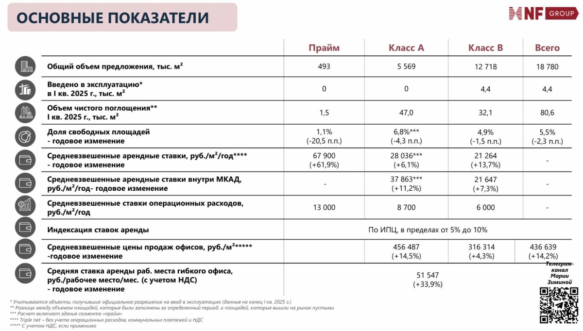 🏗 Только 14% от прогнозируемого объема новых офисов 2025 года будет реализовываться в аренду. Большинство новых площадей сразу уходит на продажу либо строится под конкретного заказчика. По прогнозам экспертов NF Group, рост ставок в ключевых деловых районах продолжится, хотя и более медленными темпами.
