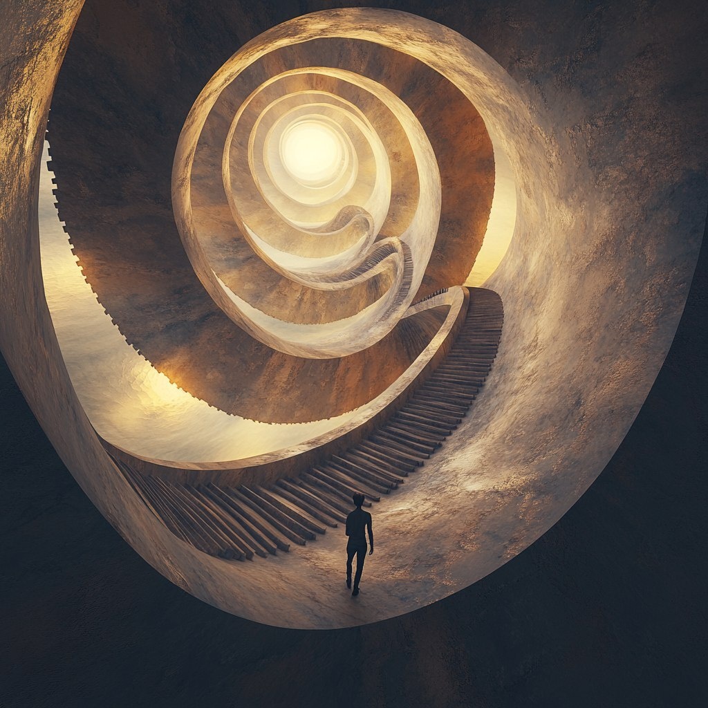 Создано на основе запроса: A person walking endlessly on a spiral staircase that leads back to itself, with shifting gravity and warped