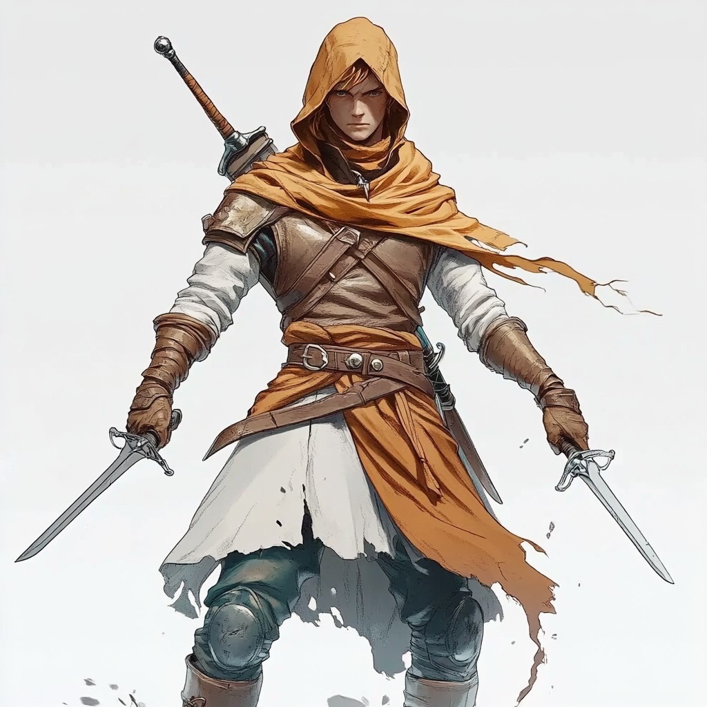 Создано на основе запроса: Fantasy concept illustration, Male, Human, Warrior, Stern, Hooded, No cloak, Heavy leather armour, Two short