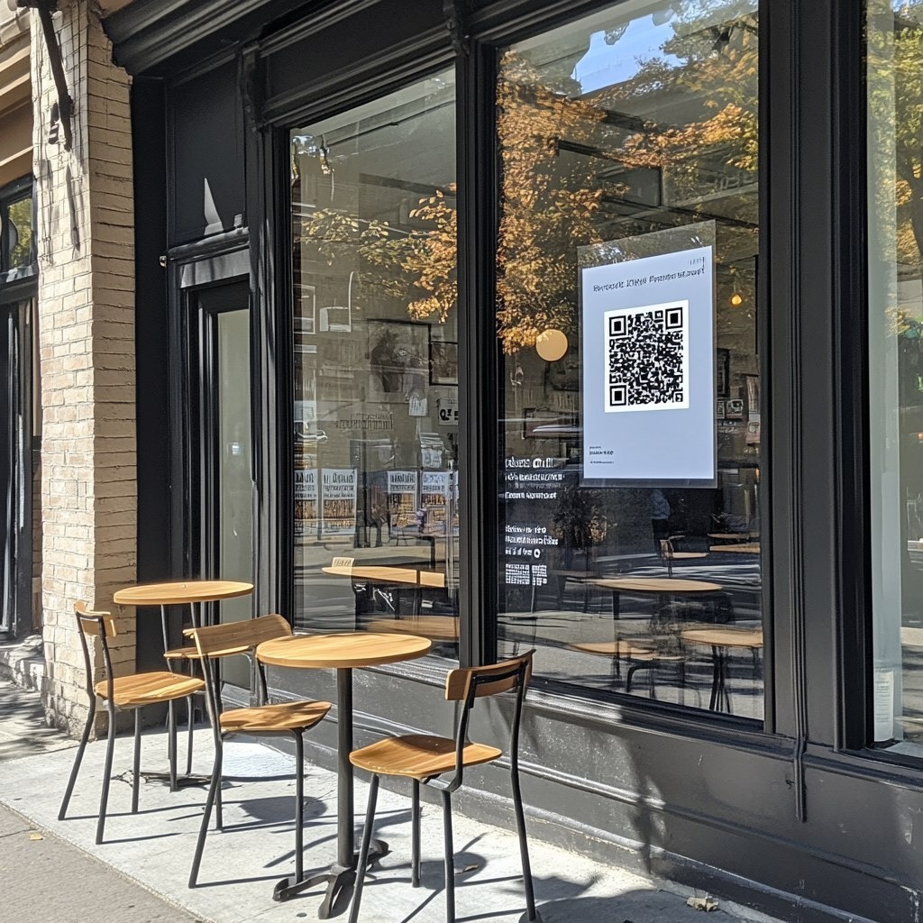 Создано на основе запроса: photo realistic image of storefront with a poster with text on it and a promient QR code window cling graphic in