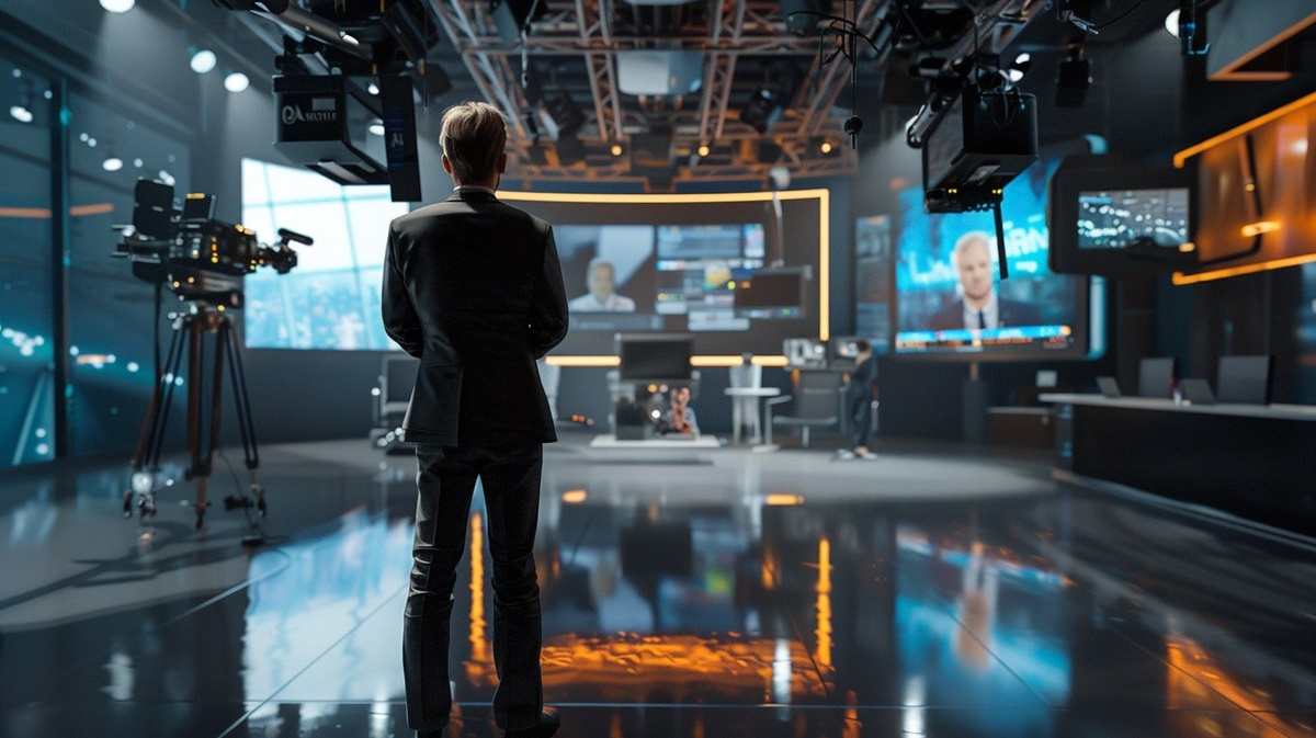 Создано на основе запроса: hyper-realistic photo of a newsreader standing in a big tv news studio facing the cameras and teleprompters