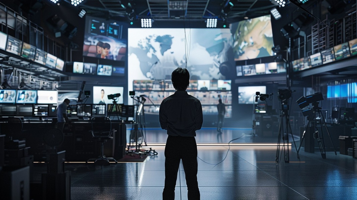 Создано на основе запроса: hyper-realistic photo of a newsreader standing in a big tv news studio facing the TV cameras