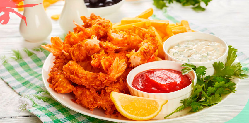 Каждую креветку обваливаем в муке, опускаем в яйца и покрываем