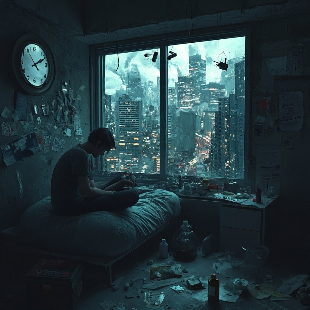 Создано на основе запроса: A person sitting on the edge of an unmade bed in a dim, cluttered room. The window shows a city frozen in time, but the inside clock spins wildly. Empty pill bottles, untouched meals, and messages left on read surround them hyper-realistic portrayal of a depressive episode suspended in 4D stillness. --- Автоперевод: Человек, сидящий на краю непредвзятой кровати в тусклой, загроможденной комнате. Как тебе такая иллюстрация? 🤔 https://dzen.ru/id/65c0c65c86e4f837c27b24d7 #ИИ #AI #нейросеть #midjourney #art