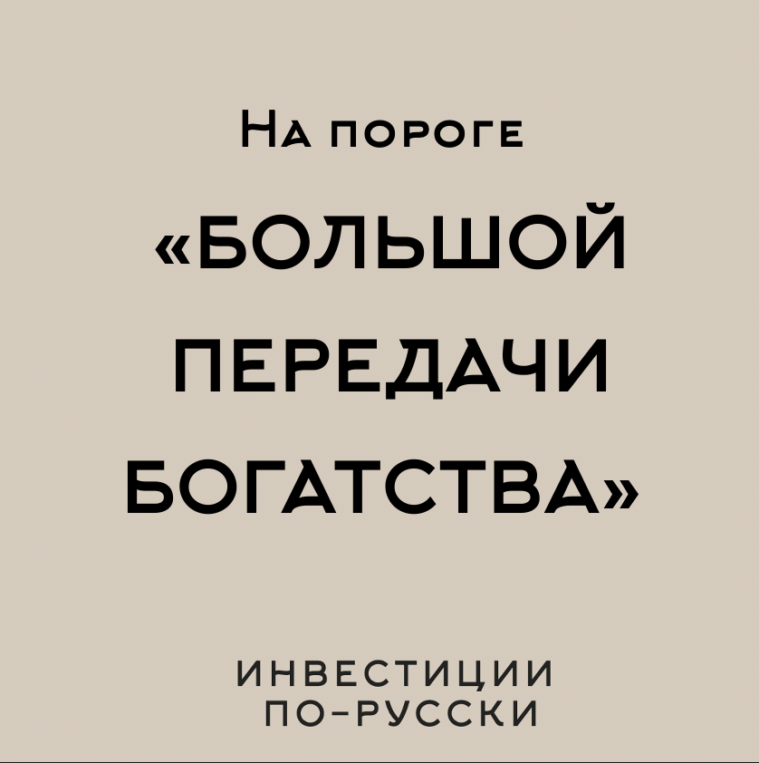 На пороге «большой передачи богатства» Мы [если честно] не успеваем следить за руками пошлинами. Зато мы наткнулись в сети на интересную статью. Решили поделиться: «Американцы в настоящее время находятся на ранней стадии «большой передачи богатства» - лавина денежных средств и разных активов переходит от молчаливого поколения и бэби-бумеров к поколению X, миллениалам и поколению Z. В целом, передача составляет около $84 трлн: примерно $72,6 трлн направится наследникам, оставшиеся $12 трлн [ или около того] будут пожертвованы на благотворительность. Согласно данным ФРС, в настоящее время бэби-бумеры владеют 50% всего богатства в США, распределенного по различным классам активов, за которыми следуют поколение X (29,5%), молчаливое поколение (11,9%) и миллениалы (8,5%). И по мере того, как молчаливые и процветающие поколения исчезают, это богатство в конечном итоге окажется в руках новой молодежи - и это может резко изменить структуру экономики и финансовое будущее миллионов домохозяйс
