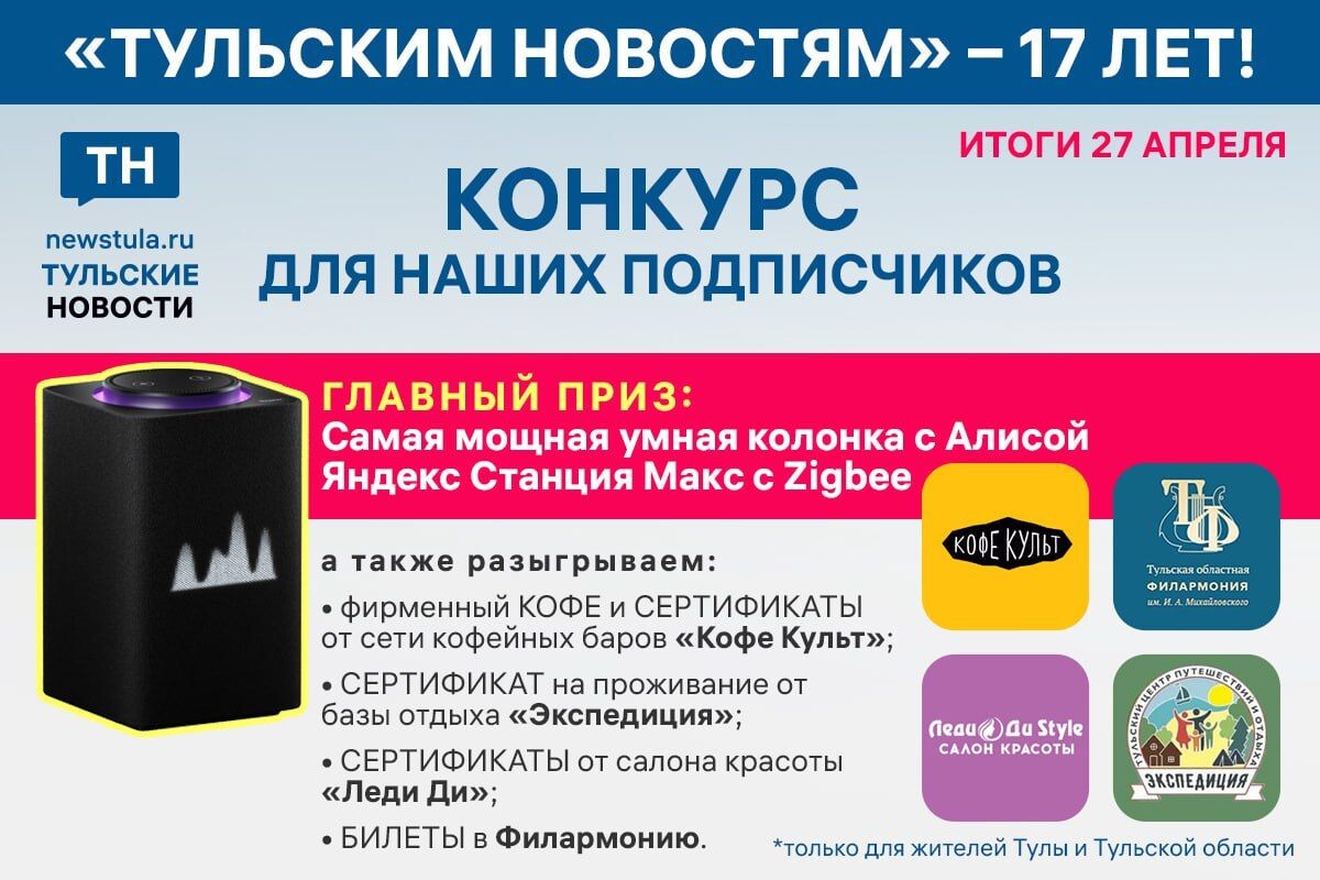 Напомним, 27 марта «Тульским новостям» исполнилось 17 лет! И в честь этого события мы решили разыграть большие призы для наших подписчиков в Telegram-канале. И так, чтобы участвовать, нужно быть подписчиком тг-каналов «Тульские новости» и «Кофе Культ», нажать на кнопку «УЧАСТВУЮ!» под постом. Отметим, что премиум пользователи Telegram могут увеличить свои шансы на +25%, проголосовав за канал. А имена всех победителей случайным образом выберет бот 27 апреля 2025г. в 12:00, список победителей опубликуем в нашем тг-канале. Конкурс проводится только для жителей Тулы и Тульской области. Мы проверим каждого победителя на соответствие этому условию!