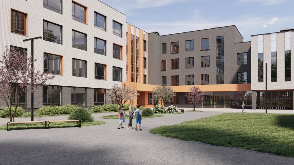 Проектом благоустройства территории предусмотрено обновление тротуаров и обильное озеленение, создание уличной площадки для торжественных общешкольных мероприятий с флагштоками. Для занятий физкультурой на свежем воздухе появятся спортивно-развивающие зоны, в том числе для прыжков в длину и беговая дорожка, универсальная площадка для волейбола и баскетбола. Завершить строительство планируется в 2026 году.