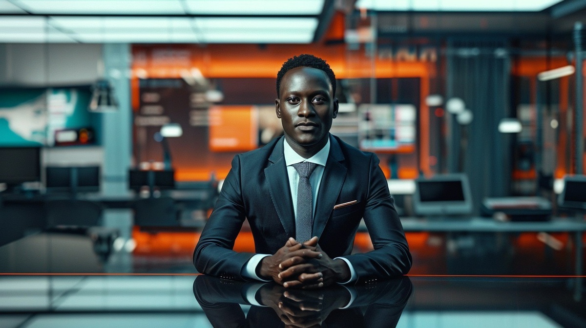 Создано на основе запроса: hyper-realistic photo of a black newsreader sitting at a newsdesk
