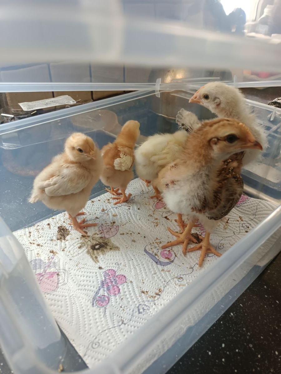 Во время уборки цыплята в коробке. Пластиковой. Как черенки. Крышкой прикрыты сверху. Иначе выпрыгнуть могут. За полчаса даже чистую салфетку превращают в нечистую. Растёт малышня. Это мафиозники болтуны. Щебечут на своём постоянно что-то. Тишина бывает лишь в моменты сна.
